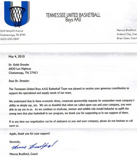 Contribution to the Tennessee United Boys AAU Basketball Team